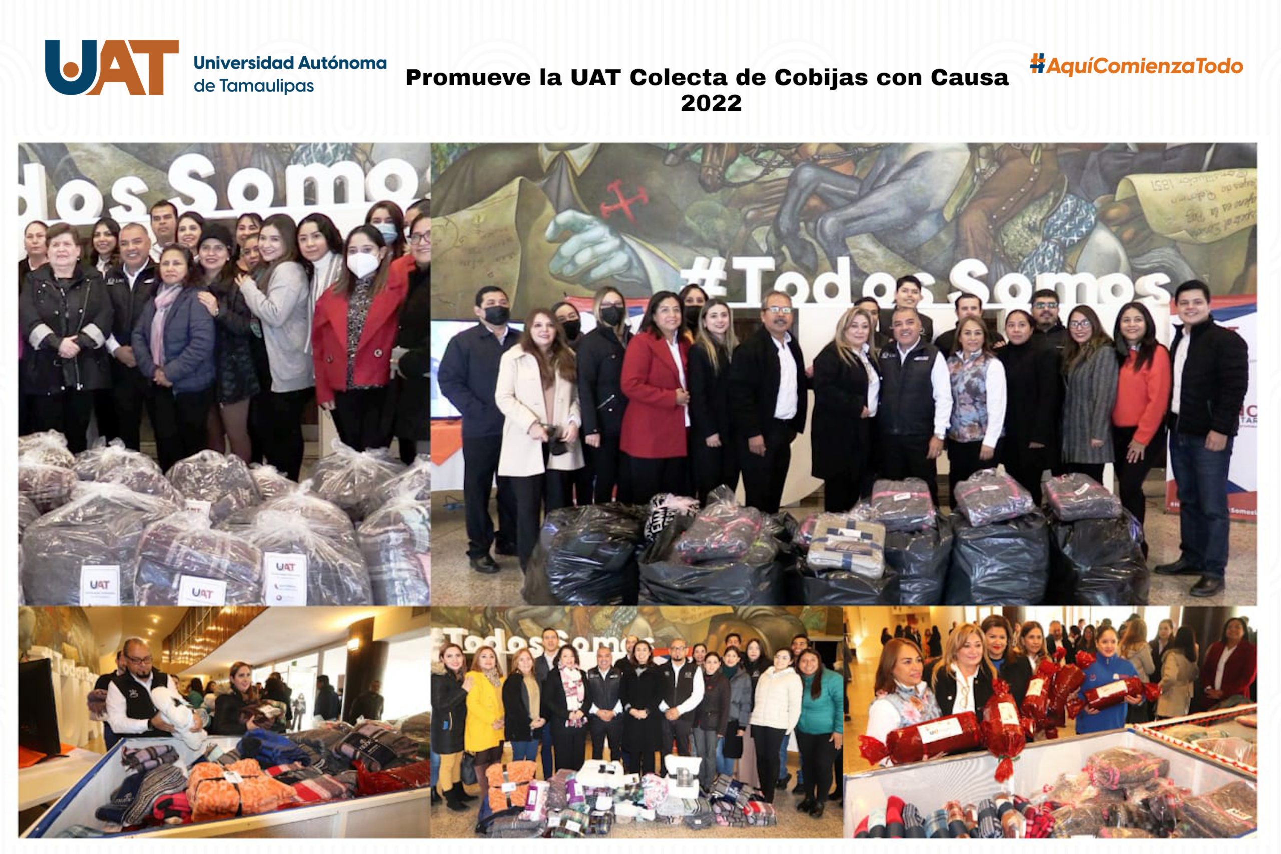 Personal de la Universidad Autónoma de Tamaulipas (UAT), perteneciente a las diversas secretarías, direcciones y dependencias de la casa de estudios, llevó a cabo la entrega de donativos recaudados dentro de la Colecta de Cobijas 2022 “Lo que se brinda de corazón se multiplica”, organizada en beneficio de las familias y comunidades más vulnerables de la entidad. El centro de acopio fue ubicado en el vestíbulo del Teatro Juárez, en Ciudad Victoria, donde la comunidad universitaria de esta institución hizo entrega de lo recabado por las distintas dependencias, como parte del programa Manos Universitarias, a cargo de la Dirección de Participación Estudiantil de la UAT. Durante la entrega se contó con la presencia de la C. P. Imelda Sustaita de Mendoza, miembro honorario de UAT U-NIDO; la Dra. Rosa Issel Acosta González, secretaria académica; la Dra. Mariana Zerón Félix, secretaria de Investigación y Posgrado; la Dra. Cynthia Patricia Ibarra González, secretaria de Gestión Escolar; así como de titulares, representantes y personal de las secretarías de Administración, Finanzas y otras dependencias universitarias. En ese contexto, el Arq. Alberto Ángel Trejo Franco, director de Participación Estudiantil, agradeció a los universitarios por sumarse a esa colecta, la cual, dentro de las políticas instrumentadas por el rector de la UAT, C. P. Guillermo Mendoza Cavazos, tiene como propósito fomentar una cultura solidaria en la comunidad universitaria para contribuir con las causas más sensibles de la sociedad. Así mismo, hizo extensiva la invitación para que estudiantes, docentes y personal académico de la UAT, así como la sociedad en general, se unan a la campaña que continuará recabando donativos hasta el próximo 23 de noviembre, en los centros de acopio instalados en la Dirección de Participación Estudiantil, ubicada en el 13 Boulevard Adolfo López Mateos, en Ciudad Victoria, y en las diferentes escuelas, unidades académicas y facultades de la UAT de todo el estado. De igual manera, detalló que los donativos serán entregados durante la temporada invernal, por la comunidad universitaria, directamente en las manos de las personas que lo necesiten y que se encuentren en albergues, hospicios y comunidades más necesitadas.