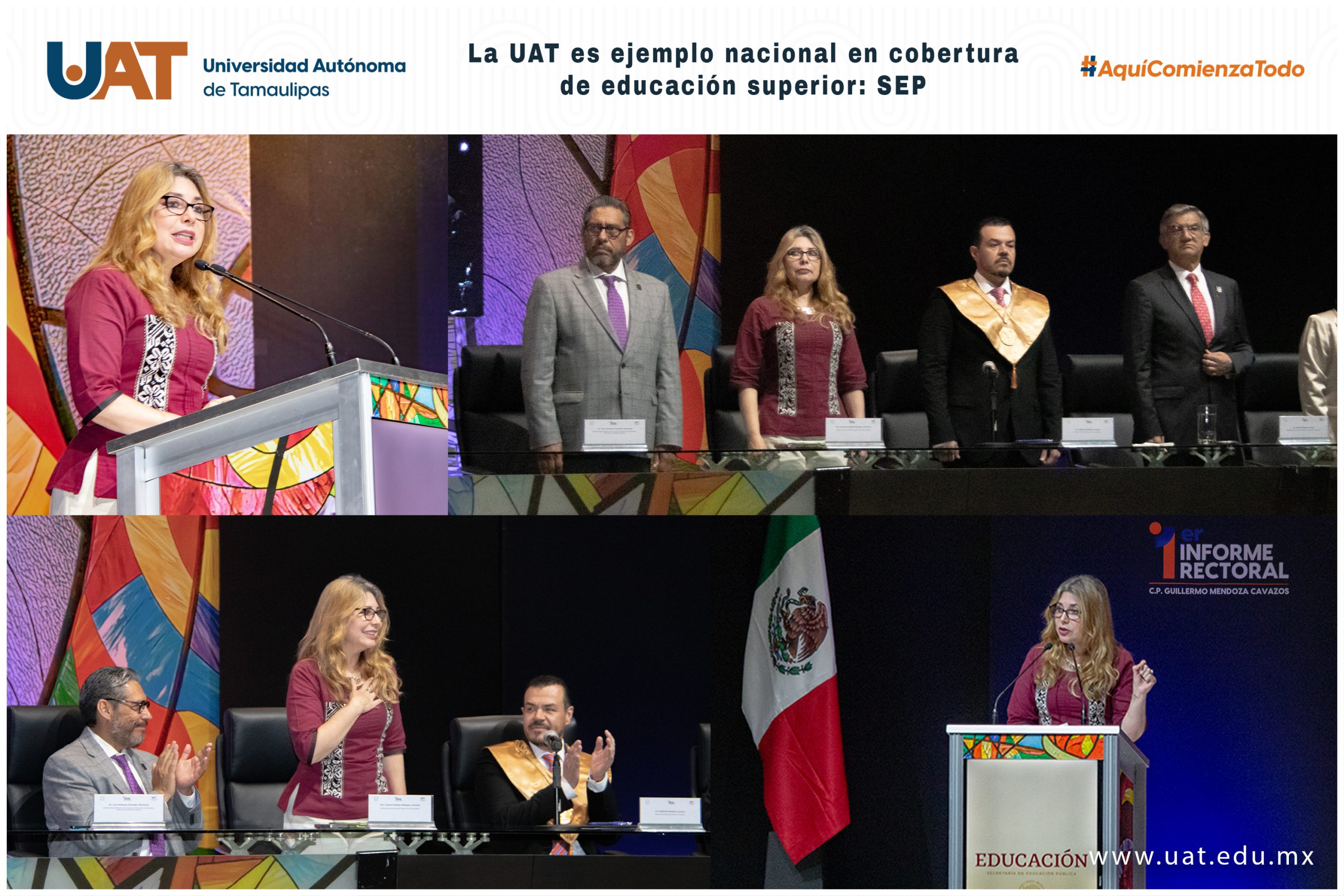 Al asistir como representante de la Secretaría de Educación Pública (SEP) al primer informe del rector Guillermo Mendoza Cavazos, la directora general de Educación Superior Universitaria e Intercultural (DGESUI), Dra. Carmen Enedina Rodríguez Armenta, afirmó que la Universidad Autónoma de Tamaulipas (UAT) es ejemplo nacional en materia de cobertura de educación superior.