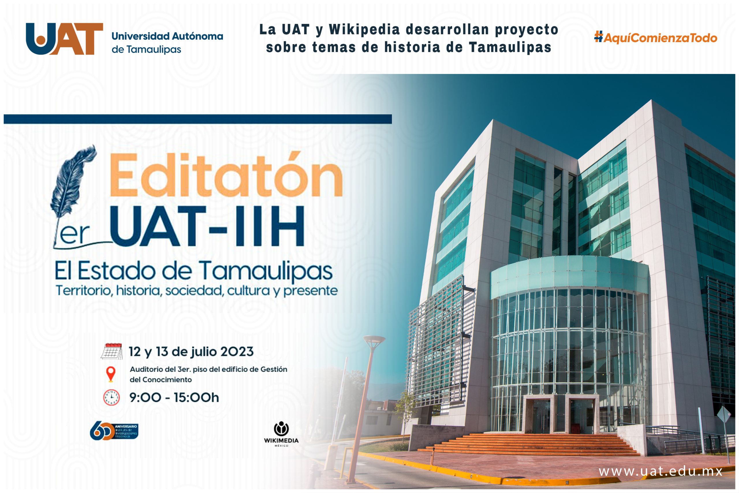 Durante los días 12 y 13 de julio de este año se llevará a cabo la primera edición del Editatón Educativo, un proyecto que realiza la Universidad Autónoma de Tamaulipas (UAT) por medio del Instituto de Investigaciones Históricas (IIH) en coordinación con Wikimedia México, organización matriz en nuestro país de la gran enciclopedia libre Wikipedia.