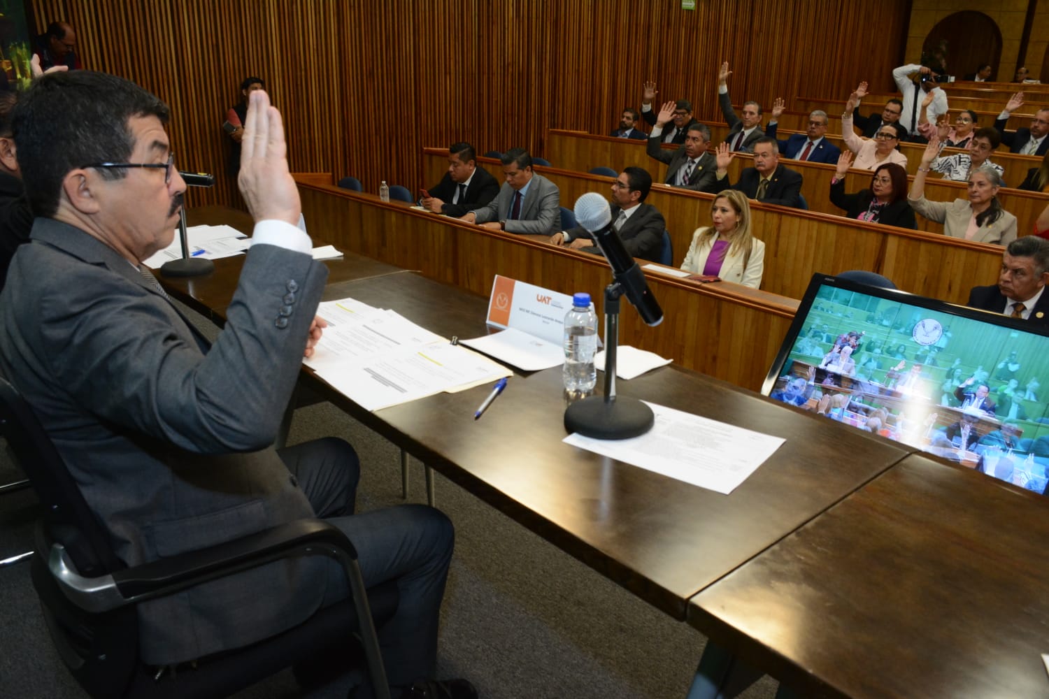 El rector dela Universidad Autónoma de Tamaulipas (UAT) MVZ Dámaso Leonardo Anaya Alvarado, presidió la sesión de Asamblea Extraordinaria en la cual los integrantes del máximo órgano colegiado universitario aprobaron la creación de dos nuevos programas de licenciatura y la apertura de nuevas sedes hospitalarias para programas académicos de posgrado.