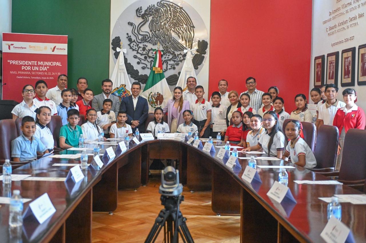 Cd. Victoria, 28 de mayo 2025. – Niñas y niños con más alto promedio académico de nivel primaria, tomaron la Sala de Cabildo para participar en el ejercicio ciudadano “Presidente Municipal por un Día”, experiencia única que brinda el Gobierno de Victoria que preside Eduardo Gattás Báez.